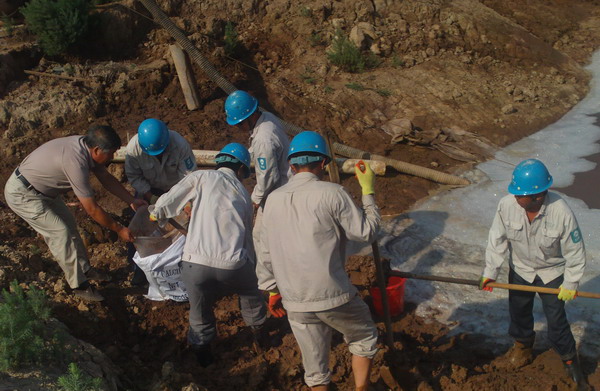 職工在準(zhǔn)備防汛泥袋