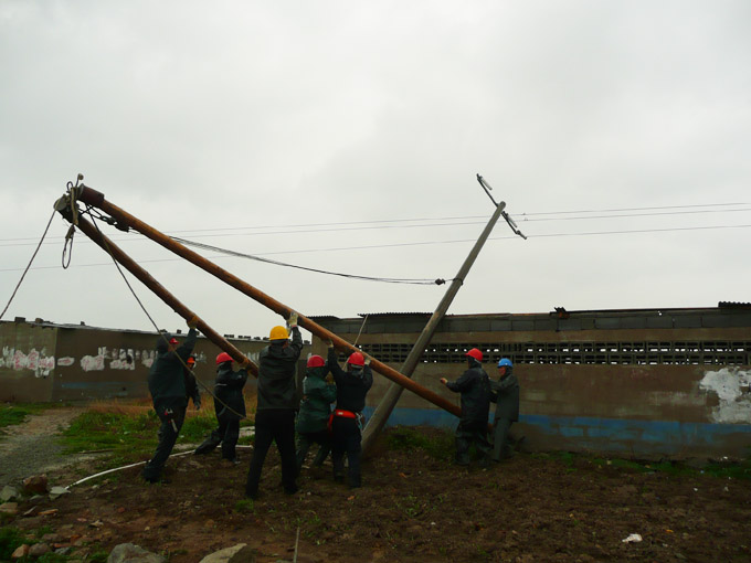 2月3日(正月初九)早上五點多,臺北供電所電力搶修值班室電話急促響起,變電所操作工反映10KV太和線跳閘失電。10KV太和線是臺北供電所非常重要的一條供電線路,是向順天木業、蘇交集團、市政瀝青等大型企業供電的重要通道,失電意味著企業生產停工。接警后,供電所外線組組長孫忠青立刻帶人沿線全面檢查。經過兩個小時的排查,終于發現處于線路末端的高速公路低壓線路的五根電桿被施工的挖掘機 撞斷拉折。獲此情況,所領導立即組織人員,準備材料,協調吊車,安排運送電桿。這時天空正下著小雨,更增加了施工的難度。為了盡快搶修,恢復供電,搶險隊伍加速向事發地點開進,寒風中的雨滴,打在職工的頭上臉上,大家毫不在意,一心撲在搶修線路上。運送電桿的道路泥軟地陷,機器吊裝遇到死角,他們就肩扛手拉。為了搶時間,爭速度,他們中午就在工地吃點快餐。在全體職工的共同努力下,到下午五點左右全面完成了搶險工作。
