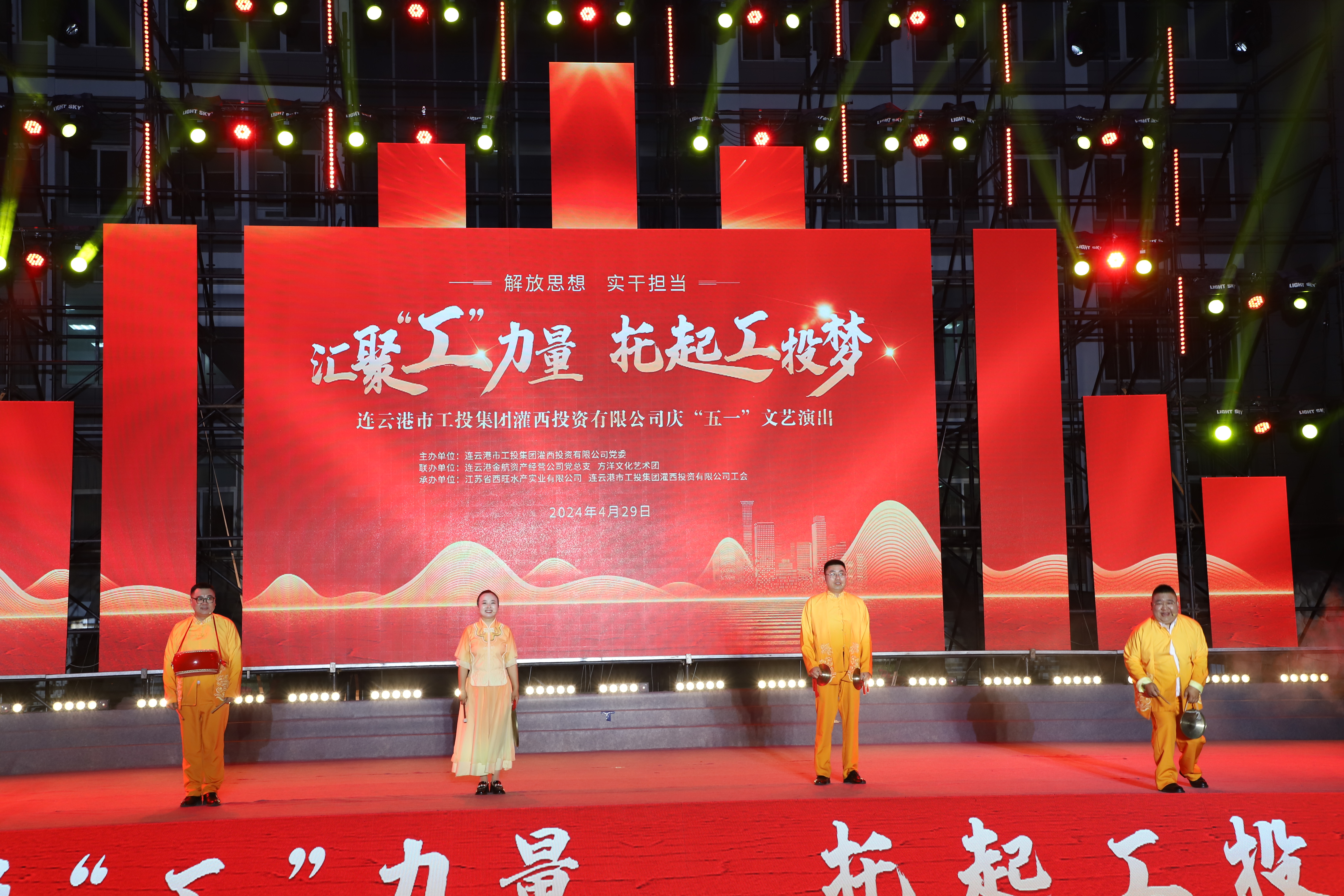 429日晚,灌西投資公司《匯聚“工”力量,托起工投夢》慶“五一”文藝演出在機關大樓前廣場舉行。本次活動由灌西投資公司黨委主辦,連云港金航資產經營公司黨總支、方洋文化藝術團聯辦,旨在通過藝術的形式,營造崇尚勞模、學習先進、尊重勞動的良好氛圍,豐富公司員工的文化生活,激發干事創業熱情。集團公司領導張六林、戴鴻鳴、汪群及部分部門負責人,灌西、金航資產經營公司領導班子成員出席演出活動,縣臨港產業區管委會、華能灌云清潔能源發電責任有限公司、徐圩新區方洋集團等有關領導受邀觀看演出。