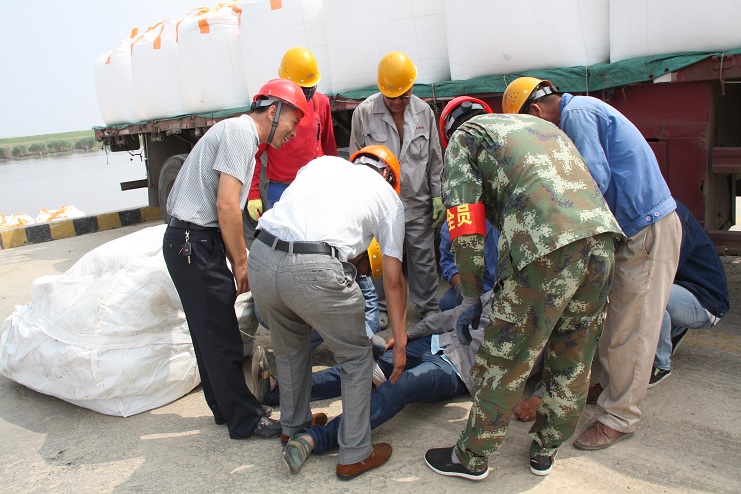 在這次的安全演練中,投資公司運營監管部部長李長軍主持了這次的安全演練活動,宵洋物流公司碼頭當班作業人員參與演練。在五灌河碼頭,正在吊裝的噸袋脫落,砸在一名操作人員的腿上,安全員王緒銀立即指揮停止作業,作業現場安全負責人陸應兵立即現場指揮人員現場施救,查看傷情,撥打120急救電話,同時向單位負責人沈志兵匯報。沈志兵及時趕到現場啟動應急預案,疏散場地車輛,讓出120進場通道,命令救援小組展開緊急救援,并向公司運營監管部和領導報告。在救援中,大家各司其職,齊心協力,配合默契,有條不紊成功完成了此次演練活動。通過這次應急演練;進一步提高了公司員工在發生安全傷害事故時的現場處置能力和自救能力。