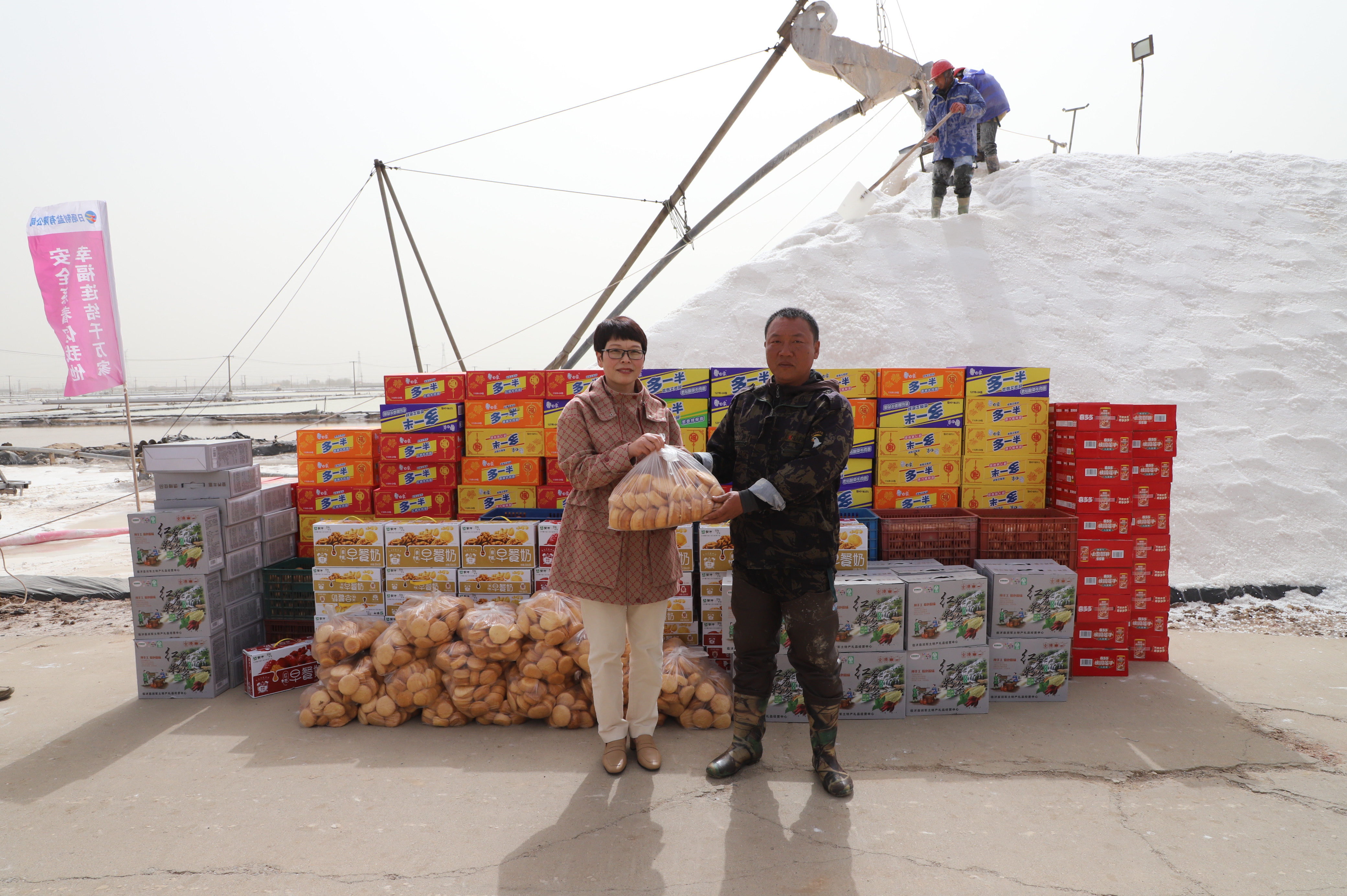 “你們辛苦了,我代表公司來(lái)看望大家。”在新河九班與埒南九班,王宏與扒鹽現(xiàn)場(chǎng)職工握手問(wèn)好,感謝他們?cè)谶^(guò)去的一年為日曬制鹽公司的原鹽生產(chǎn)所付出的辛勤努力,叮囑他們一定要落實(shí)落細(xì)扒鹽生產(chǎn)措施,增強(qiáng)責(zé)任感和警覺(jué)性,嚴(yán)格執(zhí)行各項(xiàng)規(guī)章制度,切實(shí)保障扒鹽期間的安全生產(chǎn),并送上雞蛋、八寶粥、方便面、牛奶等物品。