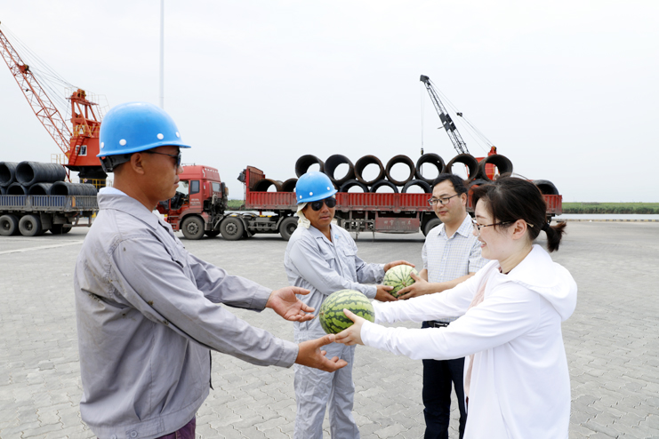 入伏以來,氣溫持續攀升,五灌河碼頭裝卸工作也迎來了夏季高溫的“烤驗”。為做好高溫酷暑期間的防暑降溫工作,確保職工工作安全和身心健康,7月25日,灌西工會一行到宵洋五灌河碼頭為堅守在崗位上奮戰的碼頭工人送去關懷和問候。
