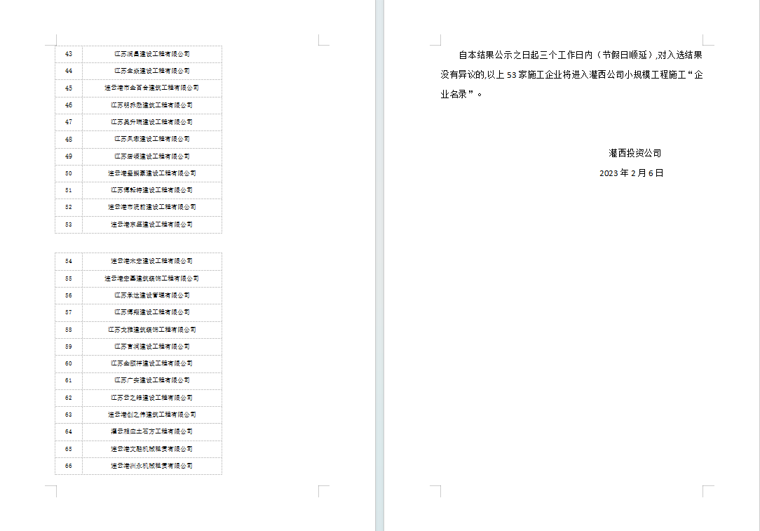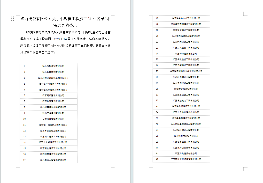 灌西投資有限公司關(guān)于小規(guī)模工程施工“企業(yè)名錄”評(píng)審結(jié)果的公示