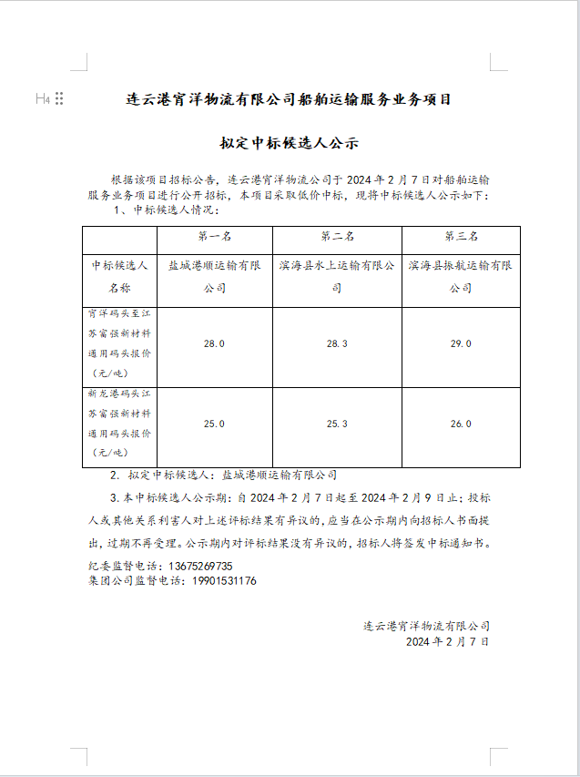 連云港宵洋物流有限公司船舶運輸服務業務項目擬定中標候選人公示