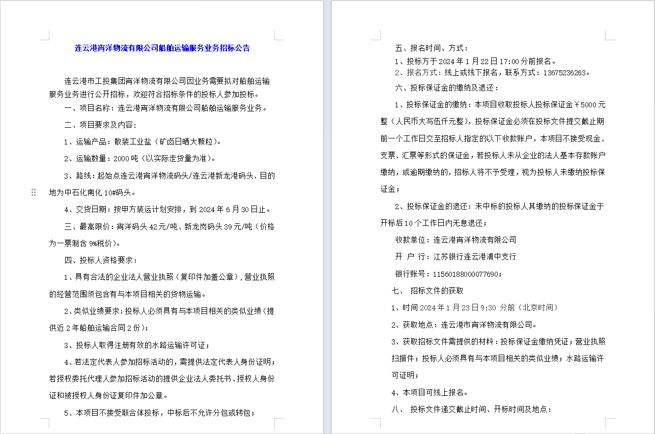連云港宵洋物流有限公司船舶運輸服務業務招標公告