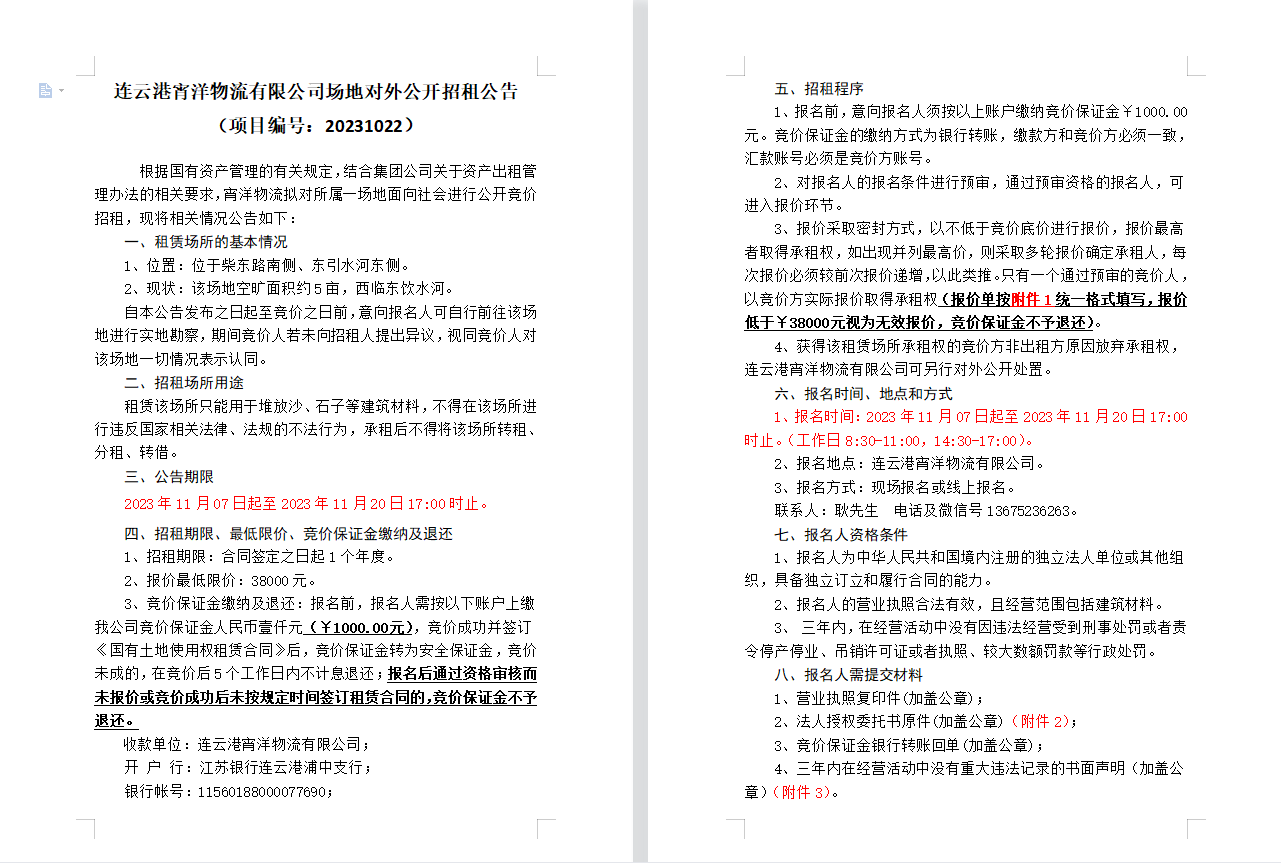 連云港宵洋物流有限公司場地對外公開招租公告