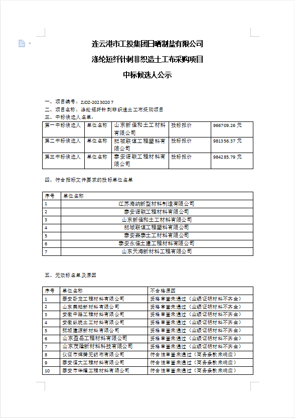 連云港市工投集團日曬制鹽有限公司滌綸短纖針刺非織造土工布采購項目中標候選人公示