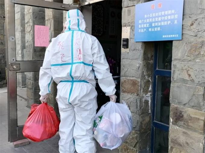 黨委工作部、工會干事張飛正在為社區居民配送生活必需品