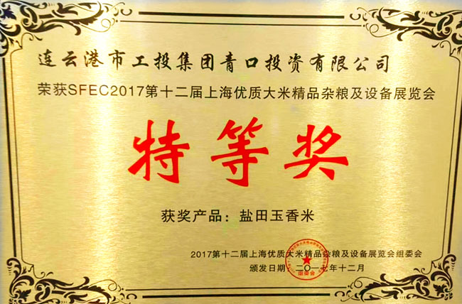 2017第十二屆上海優(yōu)質(zhì)大米及精品雜糧展覽會(huì),我公司“鹽田玉”大米榮獲特等獎(jiǎng),這是繼江蘇好大米稱號(hào)之后的又一重大殊榮。