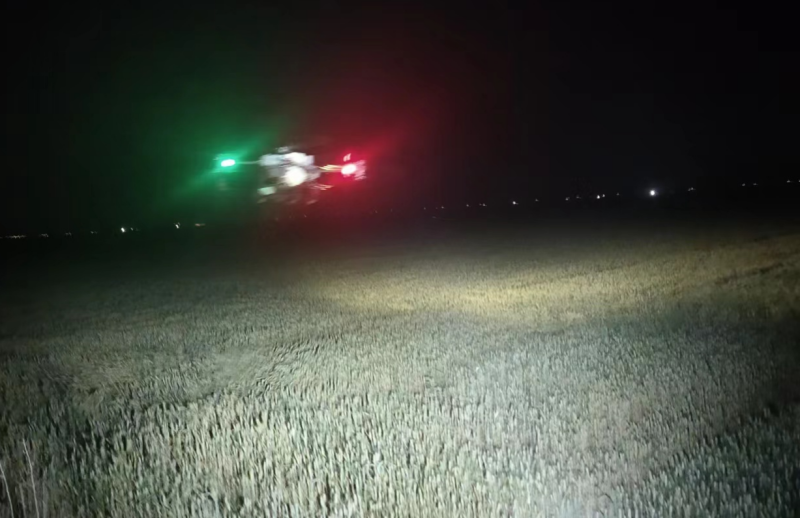 加班加點抓防治。晚上9點,大新農(nóng)場組織2臺無人植保機(jī)在耐鹽堿小麥地實施小麥化噴施葉面肥作業(yè)。