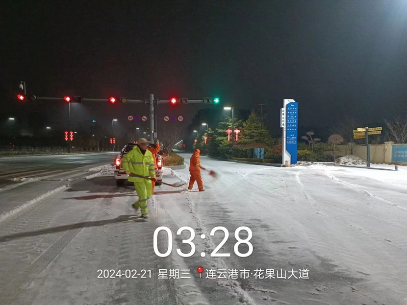 ? ? 220日晚,港城迎來了新一輪大范圍降雪,大部分地區出現凍雨伴冰粒天氣。為保障群眾出行安全,益豐園林分公司以雪為令,副經理孫杰帶領徐明磊、樊如軍、朱文健3黨員同志迅速反應,快速出擊,身披“橘”甲,浴“雪”奮戰。傍晚6點開始,從新光路涵洞區域到花果山大道東側,先鋒大橋至黃海大道區域,再到東方續道至大港東路路段,4名同志不分晝夜,連續奮戰不間斷巡查,發現積雪立即鏟除,及時消除道路安全隱患,共計撒布融雪劑8余噸,積雪清理成效明顯,為周邊群眾出行開辟出一條“溫暖平安路”。