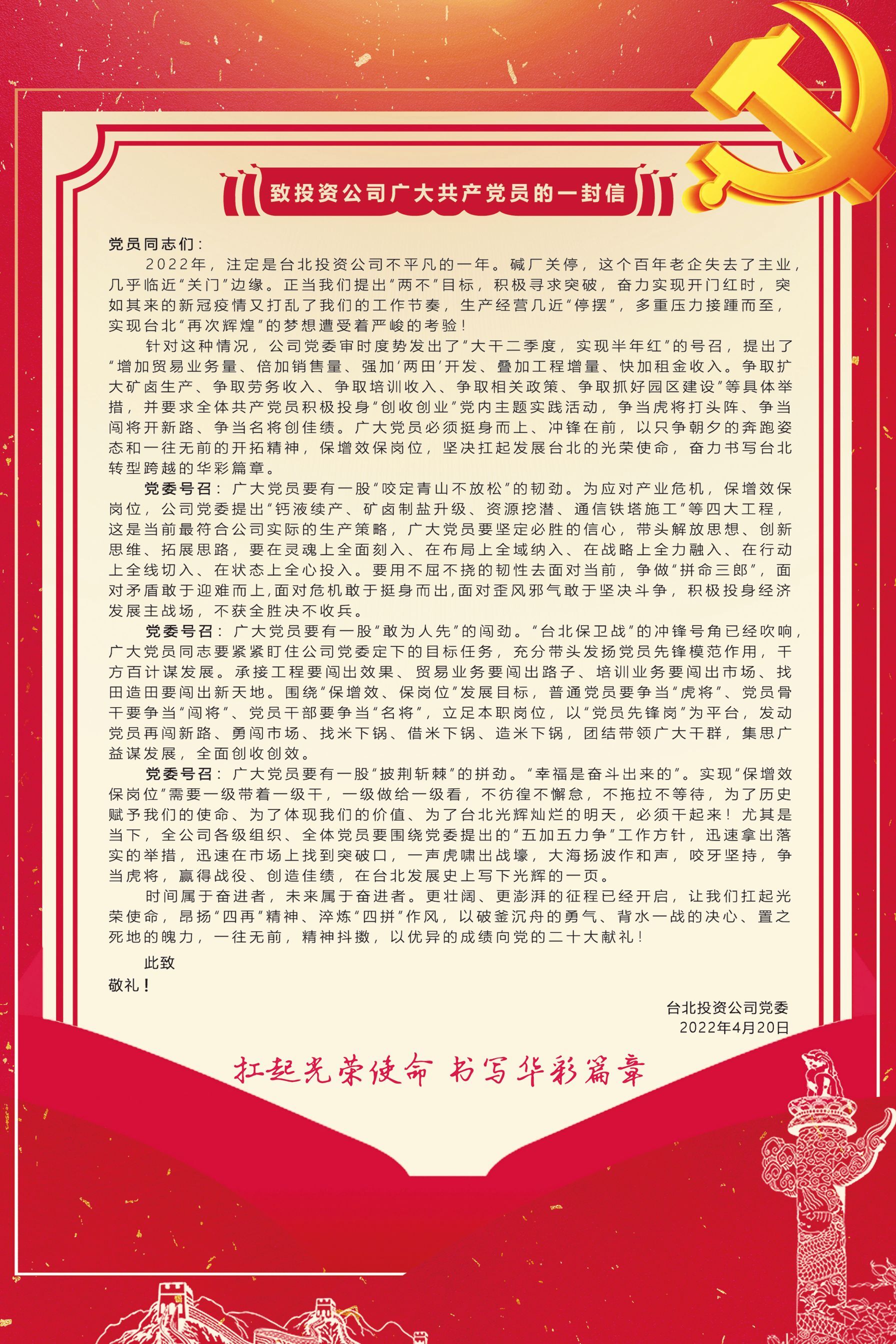 扛起光榮使命 書寫華彩篇章——致投資公司廣大共產黨員的一封信