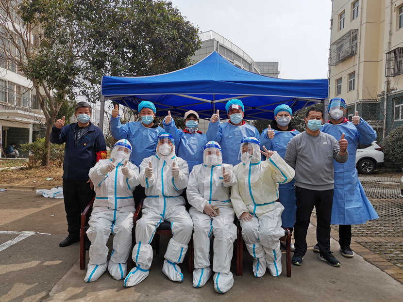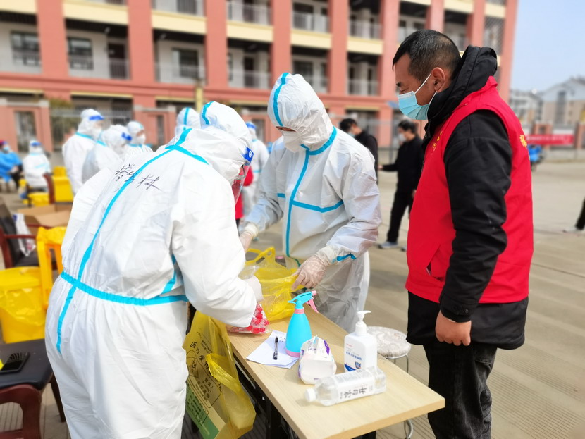 清晨630分,1號檢測點,李明同志在檢查物資,“大白”服裝4套、“小藍”服裝6套、棉簽600根……;2號檢測點,于洪亮在將物資上桌,病毒核酸檢測試管、棉簽、消毒液,“還缺少一瓶酒精,我立即反饋給社區,請社區抓緊安排送來”;4號檢測點,蘇玲、秦黎明正在互相幫忙穿好防護服,“秦姐,這個防護面罩里外有兩層薄膜,我給你撕掉,這樣就不會有霧氣了”,“嗯嗯,你這個拉鏈得拉到頂,我們自己也一定要做好防護”秦黎明溫柔的說;5號檢測點,內退黨員孫芳和姜海洋,互相在防護服后背寫上對方的名字,以便于更高效的完成檢測工作;6號檢測點,霍正鋼、朱文健、韓永剛、邱榮濱正在清點檢測小卡片;7號檢測點,張強在拿著酒精給廢物處置垃圾箱消毒;8號檢測點,新加入的孫銀、占恒春、尹永明、韓永光、趙紹慶正在給消殺噴霧劑灌裝84消毒液,社區8個檢測點的消殺工作全部由昌圩臨時黨支部志愿者負責。