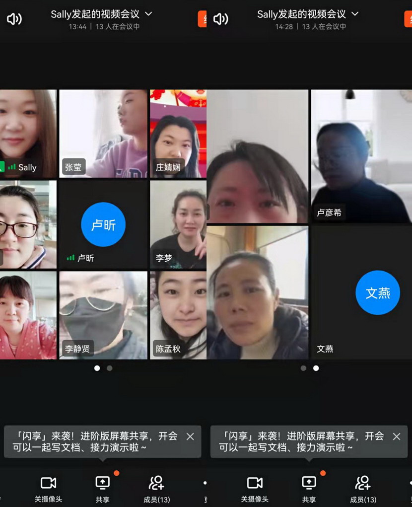 線上貢獻篇。“縱然居家隔離,一樣不防礙我們做貢獻,我們線上服務已經(jīng)開啟”三八節(jié)這一天,在社區(qū)忙碌一天的公司女工委副主任宋文靜又特意安排了“三八”節(jié)線上活動。這一天活動精彩紛呈:首先是視頻連線,通過廣大女工并向她們家人傳達市委市政府以及集團黨委、投資公司黨委關(guān)于疫情防控文件精神。其次共同學習全國“兩會”會議精神。第三,開展公司“三新”解放思想大討論線上論壇,圍繞疫情防控、生產(chǎn)經(jīng)營,尤其是企業(yè)轉(zhuǎn)型發(fā)展出謀劃策。最后還來了點小游戲-成語“飛花令”,給嚴肅的疫情防控增添了一息歡樂的氛圍。
